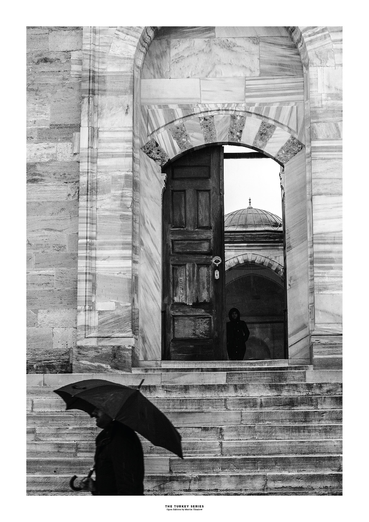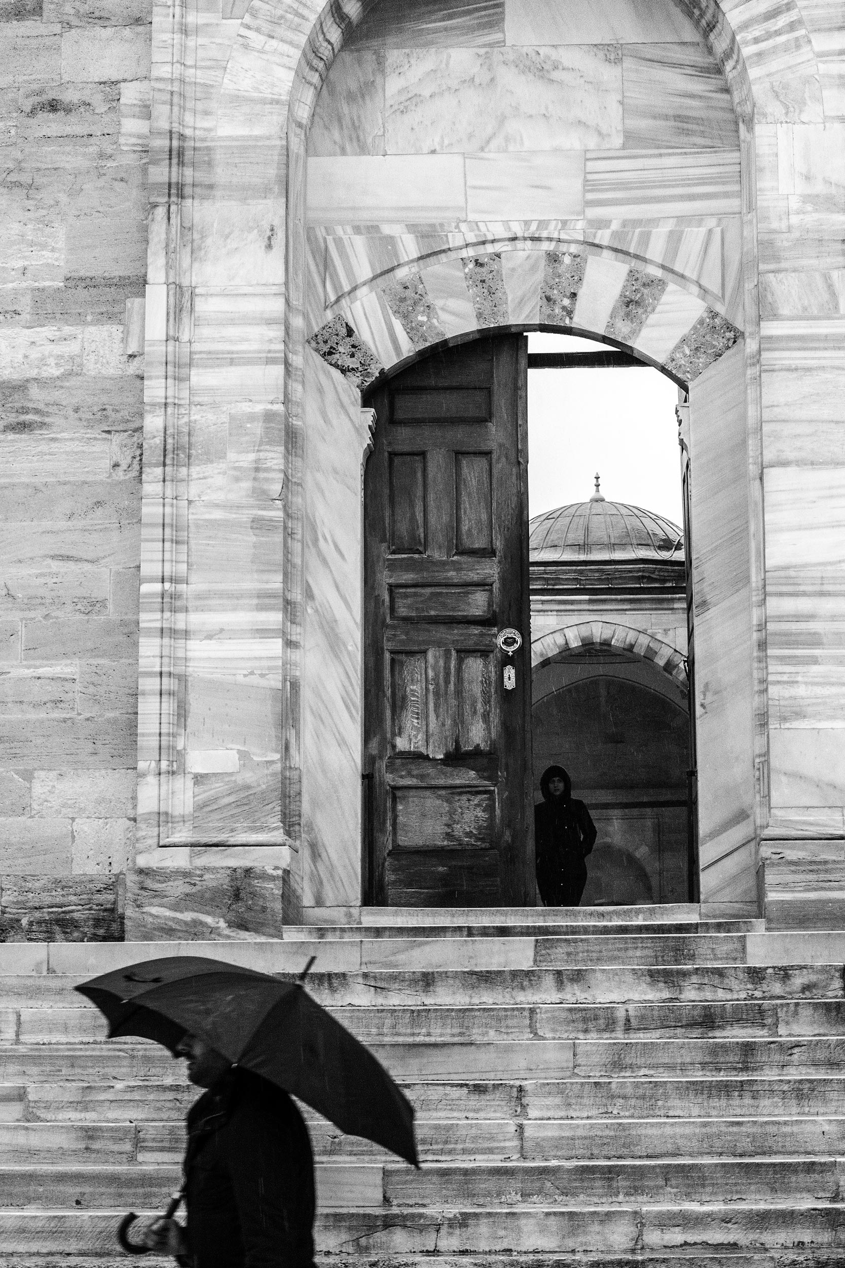 Al Fatih Mosque, a man walking past with an Umbrella.